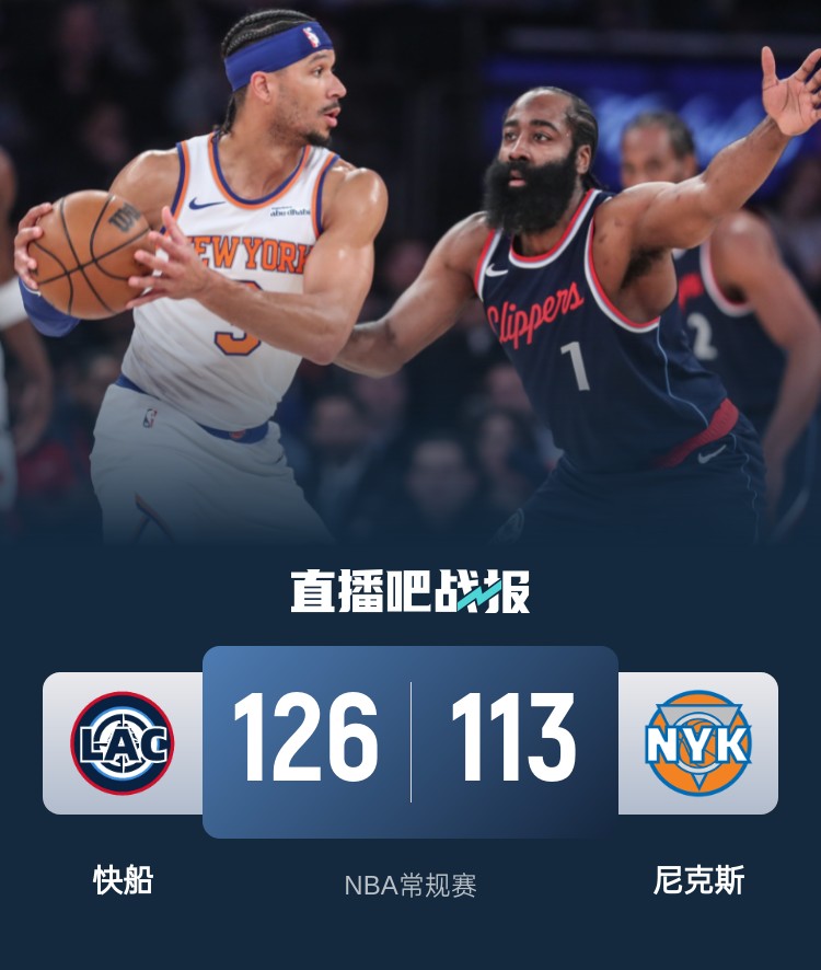 比赛开始,尼克斯率先发力打出11-2的开局,哈登连投带罚苦苦追赶,唐斯和佩恩联手带队不断扩大优势,次节尼克斯命中率下降,快船多点开花迅速迫近比分,哈登高效输出,半场战罢快船54-55仅落后1分。易边再战,快船火力全开,哈登单节狂砍16分4助率队获得两位数优势,末节小卡挺身而出连得10分带队一度将分差拉开到19分,尼克斯努力追赶,小卡再现战神本色连投带罚压制对手反扑势头。最终,快船126-113击败尼克斯,升至西部第6。