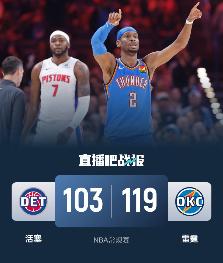 首节对决雷霆延续近期火热状态打出完美攻势,他们进攻端多点开花无视防守半节时间就轰下25-12的攻势早早拉开比分,首节狂揽41分的同时拿到14分的领先。次节雷霆状态有所回落而活塞开始反扑,小哈达威成为奇兵单节砍下13分,活塞在他的带动下不断蚕食分差并追至6分进入下半场。休息归来亚历山大再度单节拿下12分,雷霆稳定输出单节再胜10分并重新拉开两位数分差;但末节活塞卷土重来回敬17-5的攻势追至4分又重燃希望,不过多特随后连续命中关键三分,活塞则自乱阵脚连续失误,雷霆重新拉开两位数分差锁定胜局。最终,雷霆主场击退活塞豪取11连胜。