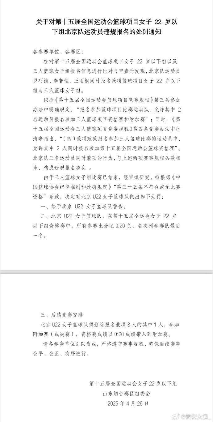 处罚通知显示,北京U22女篮罗巧梅、李若莹、王雨桐3名运动员同时报名全运会U22女篮和三人女篮,超过了竞赛规程中规定的2人上限。处罚通知援引竞赛规程相关规定:“兼项政策报名参加三人篮球比赛的运动员中,允许其中 2 人同时报名参加第十五届全国运动会篮球资格赛。”
