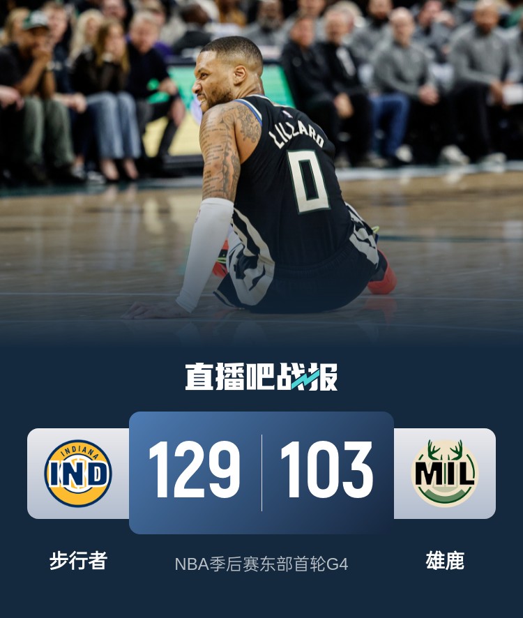 利拉德重伤 哈利17+8+15 字母哥28+15 步行者3-1擒鹿夺赛点
