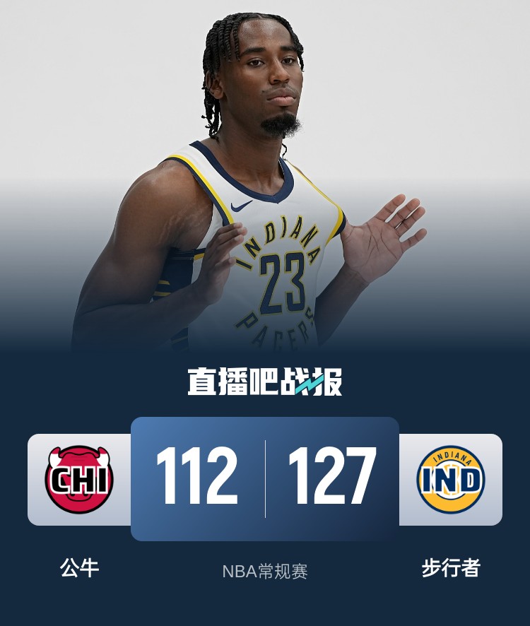 比赛开始,双方都进入状态较快,公牛失误不少,步行者打出8-0小高潮建立主动权,但公牛马上回应10-2一度反超比分,比分交替领先,首节步行者领先1分,次节科比-怀特连中3记三分拉开比分,但哈利伯顿连续三分回应,步行者始终咬住比分,半场公牛领先1分。下半场,双方展开拉锯战,公牛连续失误,哈利伯顿抢断推反击,内史密斯接连3记三分一度领先双位数,但公牛全民皆兵还是追到差3分,末节内史密斯里突外投连续砍分,步行者发力重新拉开比分,随后步行者牢牢掌握住10分左右领先,最终步行者127-112力克公牛。