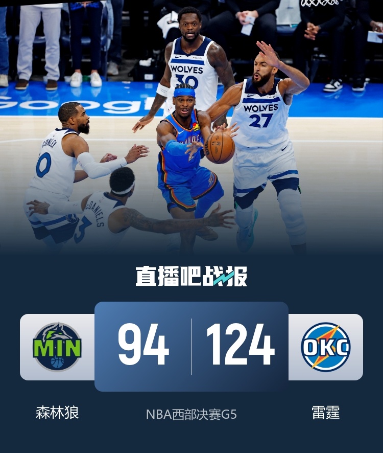 半场打花!雷霆4-1森林狼晋级总决赛!SGA34+7+8 华子18中7