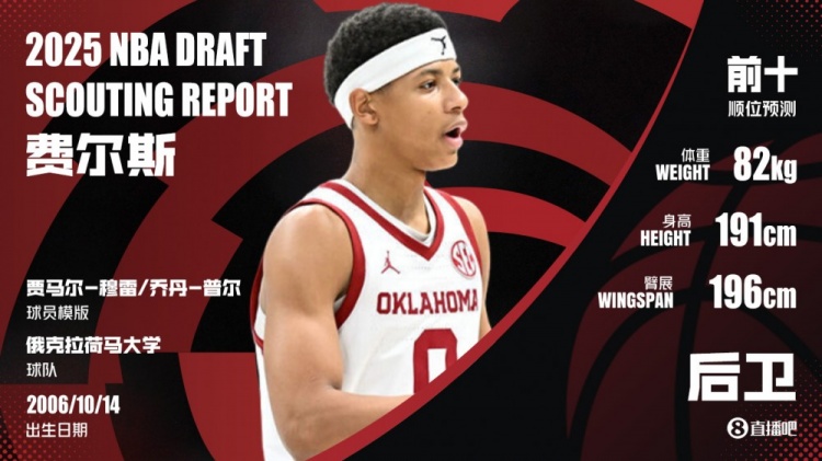 费尔斯身高(裸足)1米91,体重82公斤,臂展1米96。2024-25赛季(大一赛季),费尔斯出战34场,场均30.2分钟,得到17.1分4.1篮板4.1助攻1.6抢断,投篮命中率43.4%,三分命中率28.4%,罚球命中率85.1%。