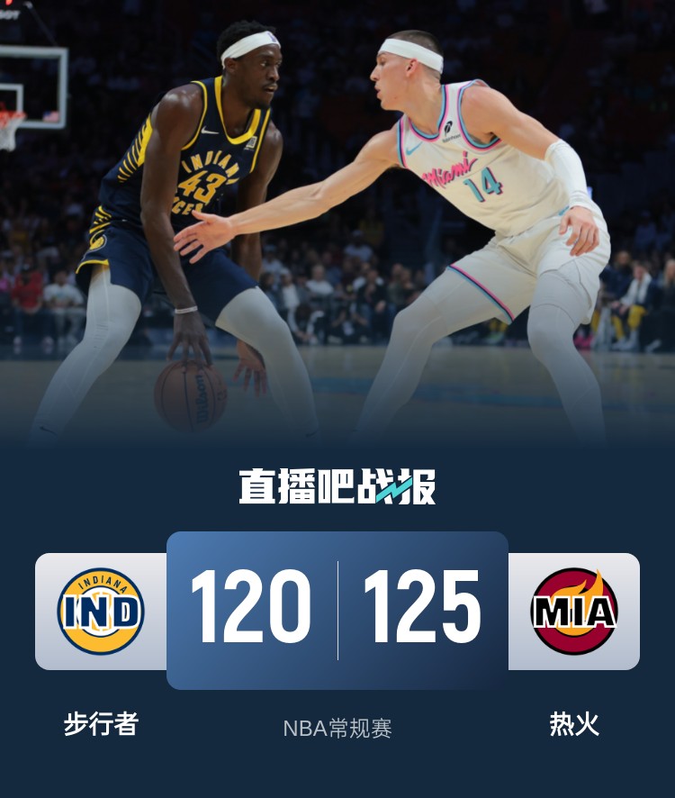此役一上来双方稍显慢热,西亚卡姆连投带罚不断取分,希罗及时发力给予回应,但末段步行者再度发力占据上风,首节结束时步行者领先6分,次节回来,热火多点开花开始追分,特纳率队止住颓势,半场战罢,步行者依然领先1分。易边再战后两队你来我往陷入鏖战,海史密斯里突外投率队反超,热火领先5分进入末节,末节上来,双方僵持至最后时刻,米切尔飚中制胜三分,步行者进攻不中后犯规太晚,希罗两罚全中锁定胜局,最终热火125-120力克对手。