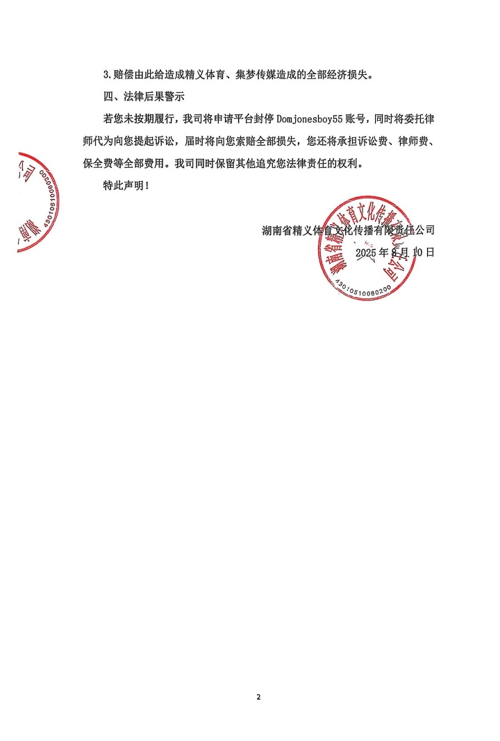 您(微博账号:Domjonesboy55)于2025年8月9日06:00(美国时间)发布标题为“When will 116 pay this money?”的内容,捏造“集梦拖欠百万奖金”事实,该内容已在网络平台广泛传播。现湖南省义体育文化传播有限责任公司(以下称“精义体育”)依法声明如下: