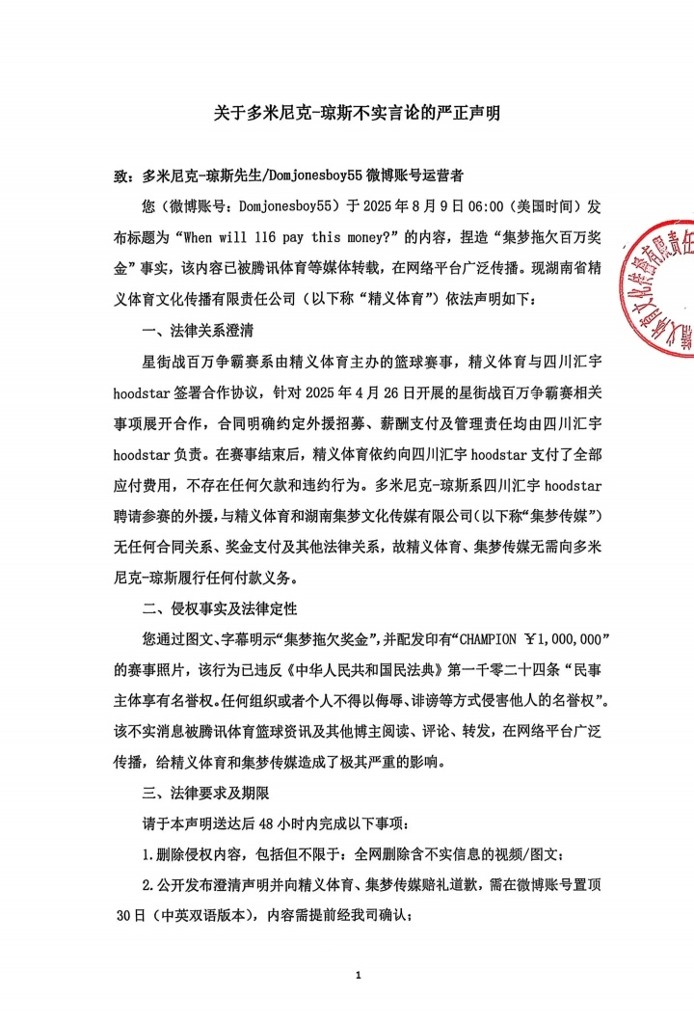 星街战百万争霸赛系由精义体育主办的篮球赛事,精义体育与四川汇宇hoodstar签署合作协议,针对2025年4月26日开展的星街战百万争霸赛相关事项展开合作,合同明确约定外援招募、薪酬支付及管理责任均由四川汇宇hoodstar负责。在赛事结束后,精义体育依约向四川汇宇hoodstar支付了全部应付费用,不存在任何欠款和违约行为。多米尼克-琼斯系四川汇宇hoodstar聘请参赛的外援,与精义体育和湖南集梦文化传媒有限公司(以下称“集梦传媒”)无任何合同关系、奖金支付及其他法律关系,故精义体育、集梦传媒无需向多米尼克-琼斯履行任何付款义务。