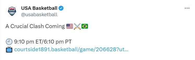 赛前,美国男篮官推为这场比赛进行了预热,配文写道:“一场关键的战斗即将打响。”