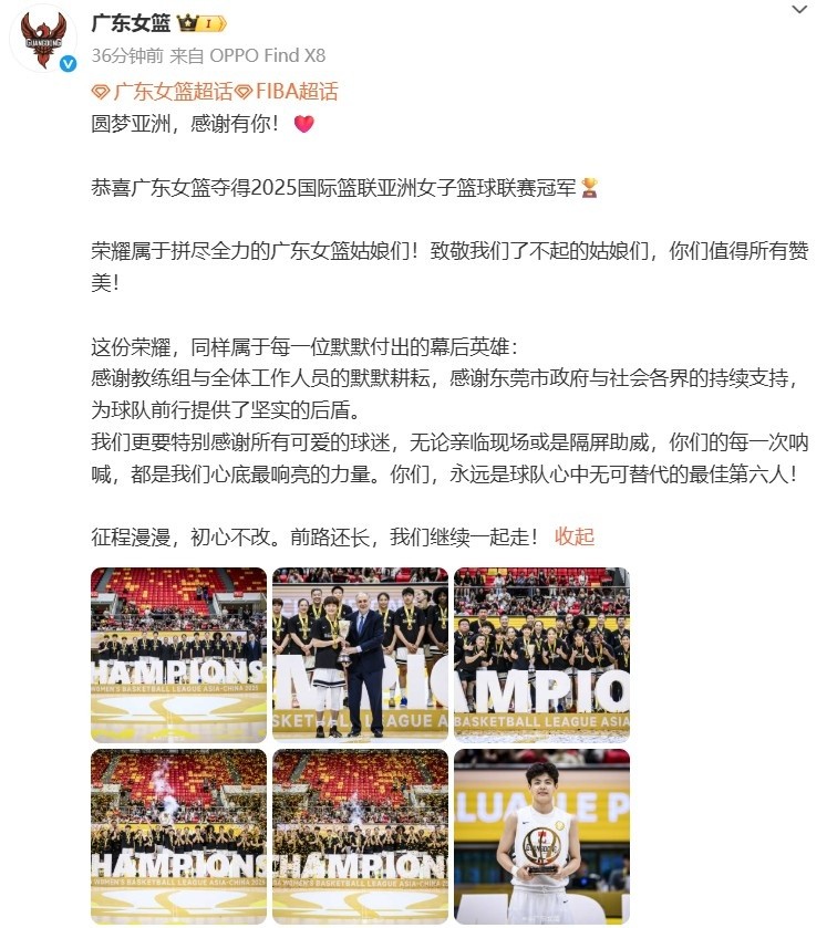 亚洲女子篮球联赛冠军!广东女篮官博:圆梦亚洲 我们继续一起走