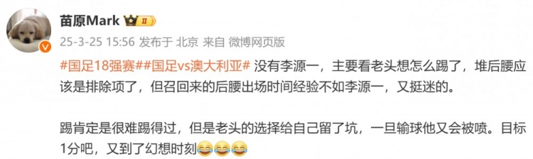 3月25日讯 国足今晚将在世预赛杭州主场对阵澳大利亚,媒体人苗原发文谈到对国足阵容的看法。