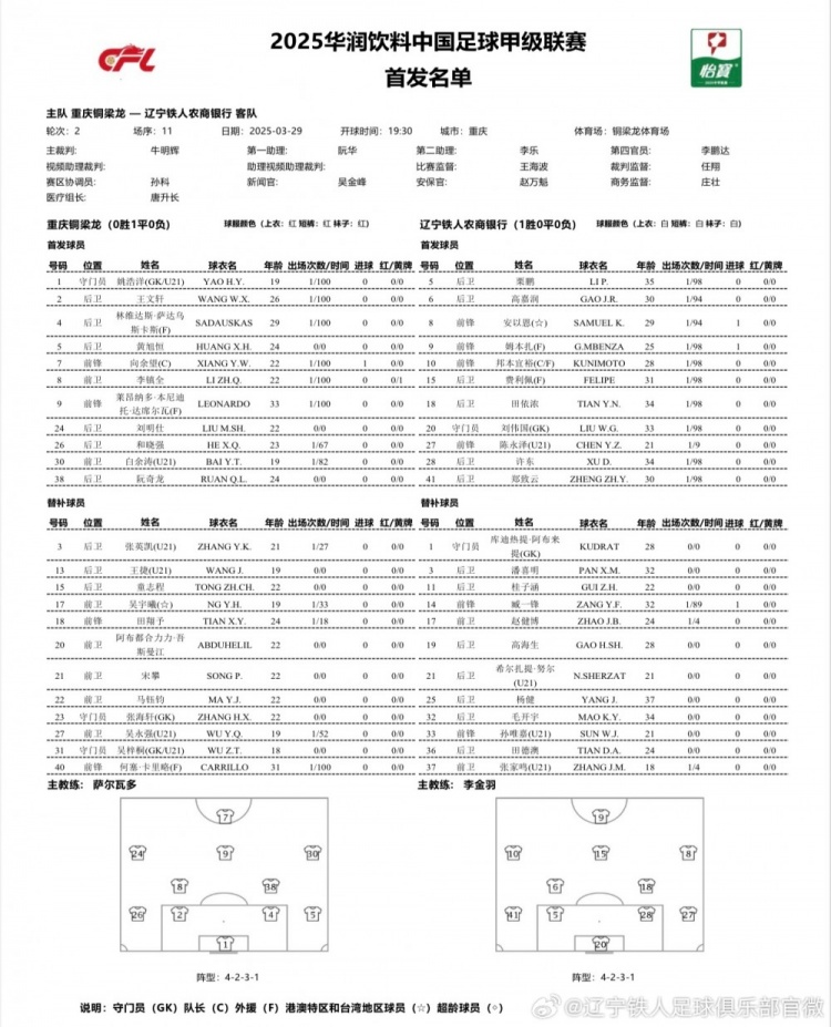 重庆铜梁龙首发:1-姚浩洋(U21)、2-王文轩、4-萨达乌斯卡斯(F)、5-黄旭恒、24-刘明仕、26-和晓强、38-阮奇龙、8-李镇全、30-白余涛(U21)、7-向余望、9-莱昂纳多(F)