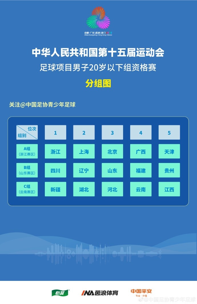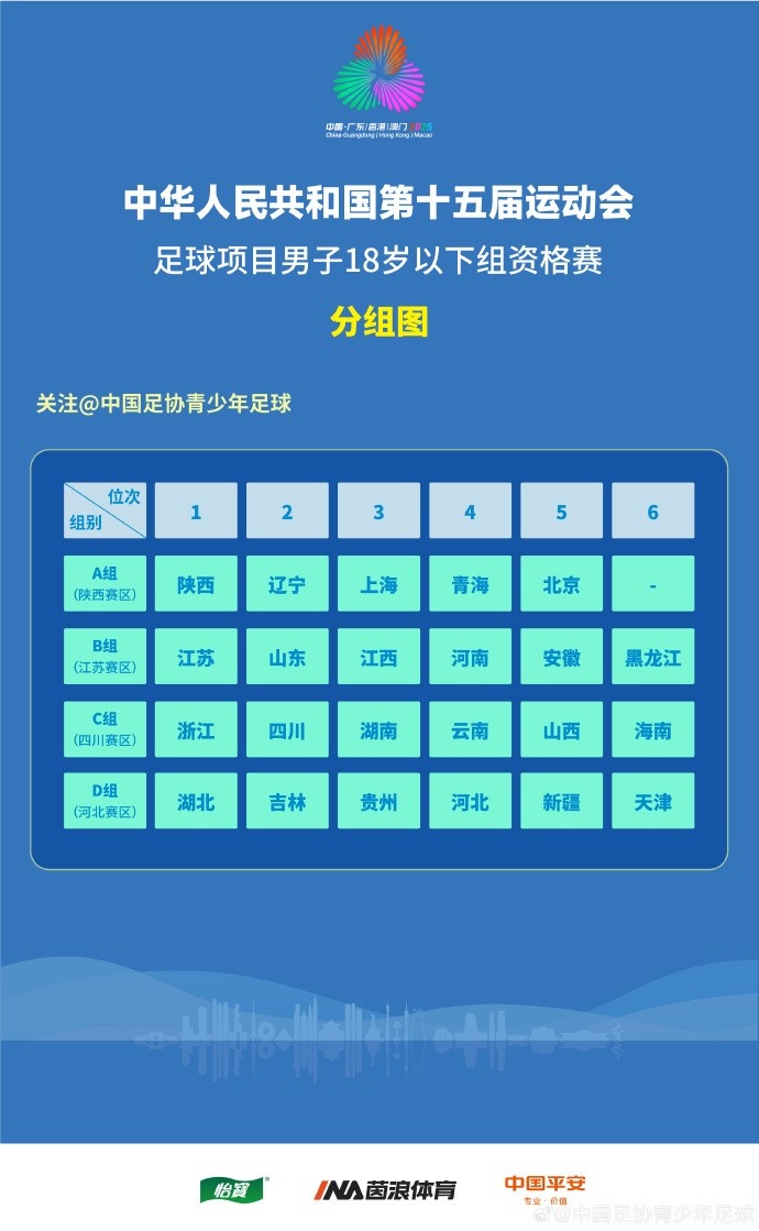 全运会U20男足资格赛分组:浙江上海北京同组,四川辽宁山东同组