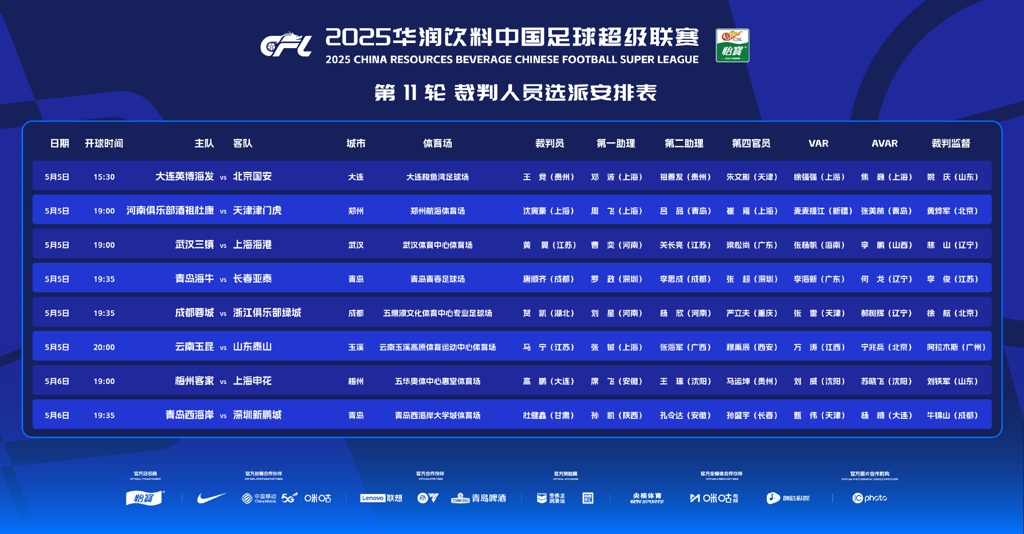 05月05日讯 中超官方公布第11轮裁判人员选派安排,马宁执法云南玉昆vs山东泰山,王竞执法大连英博vs北京国安。