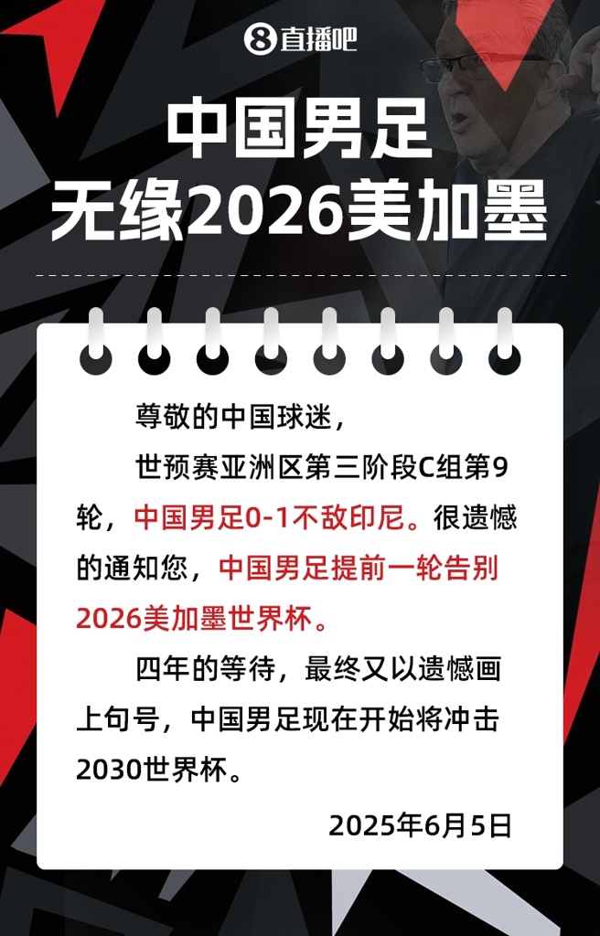 06月06日讯 世预赛亚洲区第三阶段C组第9轮,国足客场0-1不敌印尼,提前1轮无缘2026美加墨世界杯。