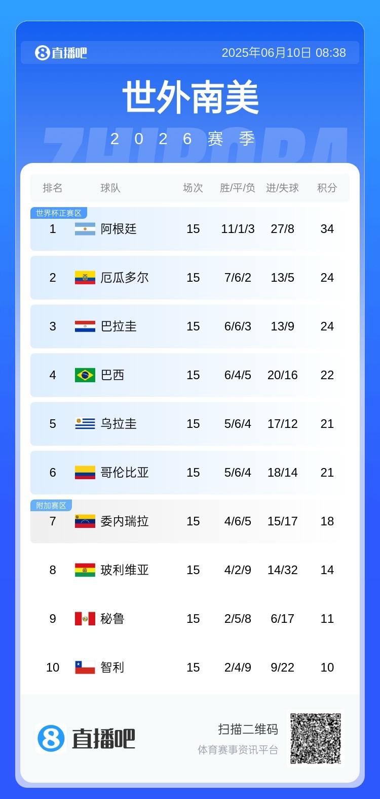 当前南美世预赛积分榜↓