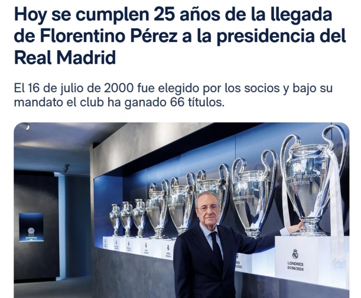 07月16日讯 皇马官方发文:今日是弗洛伦蒂诺担任皇家马德里主席25周年。球队在他的领导下,总计赢得了66个冠军。