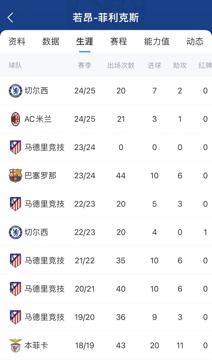 2023年1月,菲利克斯租借加盟切尔西,开启了自己的流浪生涯。两年间菲利克斯先后辗转马竞、巴萨、切尔西、AC米兰4支球队,但在每支球队效力都没能超过半年。目前25岁的菲利克斯德转身价为2000万欧元,而在19岁时,菲利克斯的最高身价曾达到1亿欧元。