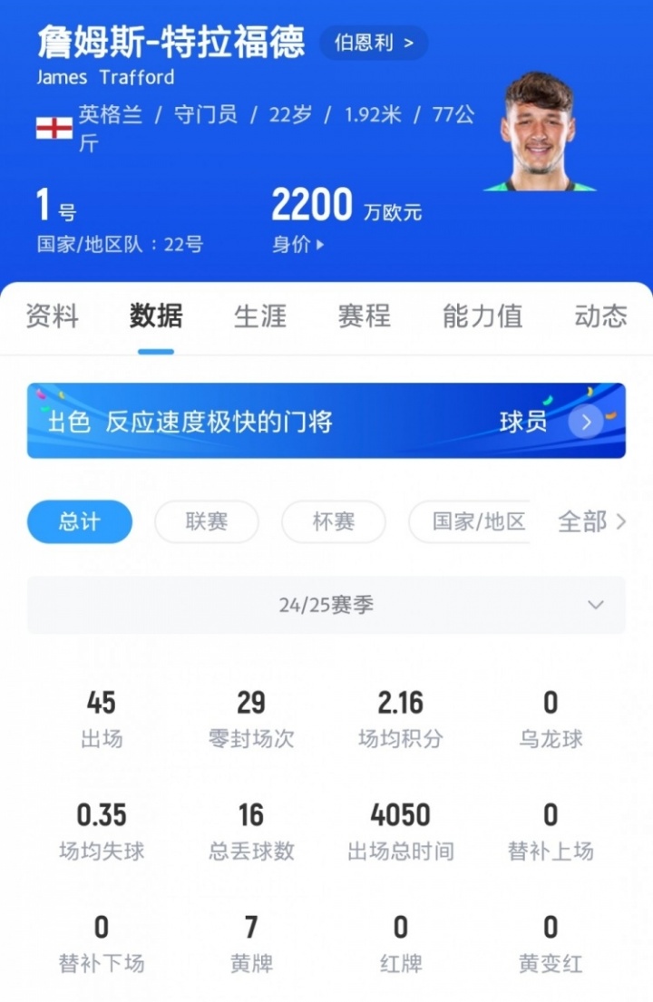 特拉福德2023年以1730万欧转会费从曼城加盟伯恩利,上赛季出战45场比赛,丢掉16球,帮助伯恩利重返英超。