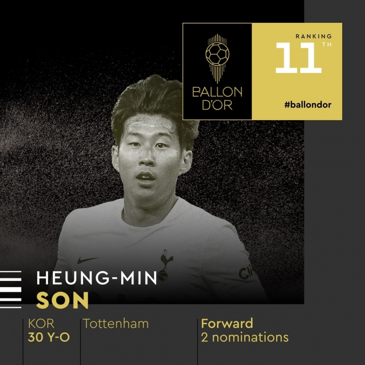 此外,孙兴慜在2022年排名金球奖第11位,目前仍是亚洲球员获得过的历史最高排名。