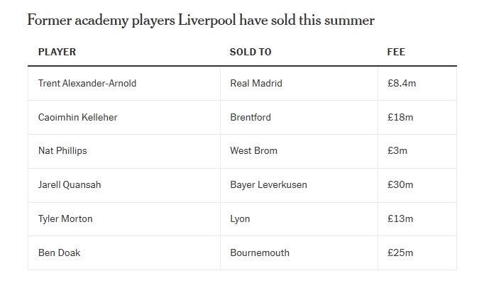 过去五年里,利物浦通过出售代表俱乐部参加过青年比赛的球员,收入超过2亿英镑。仅今年夏天,他们就通过阿诺德(皇家马德里)、凯莱赫(布伦特福德)、纳特-菲利普斯(西布朗)、贾雷尔-昆萨(拜耳勒沃库森)、泰勒-莫顿(里昂)和本-多克(伯恩茅斯)的转会,赚取了约1亿英镑。埃利奥特以430万英镑从富勒姆加盟时年仅16岁,他在截止日以租借形式加盟阿斯顿维拉,明年夏天将以3500万英镑的价格强制买断。