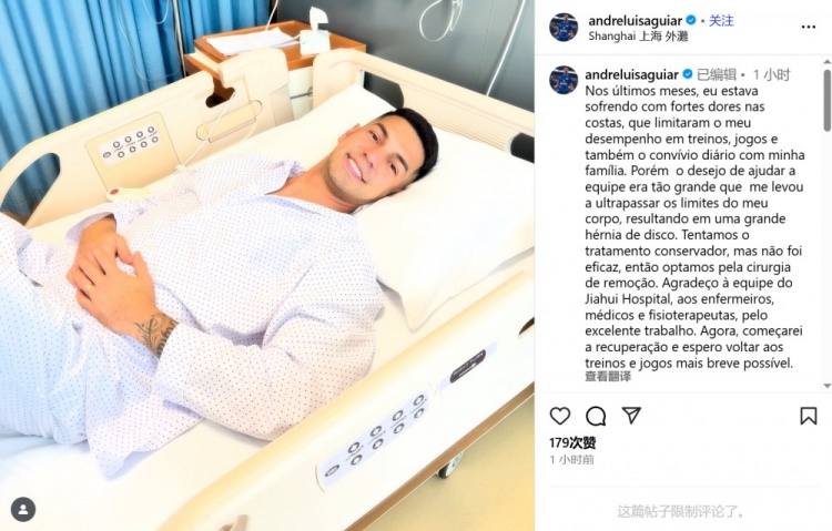 9月8日,申花官方消息,球队前锋安德烈-路易斯腰椎间盘微创切除术,预计将伤缺六周左右。今天,路易斯社媒晒照,他已经成功接受手术。