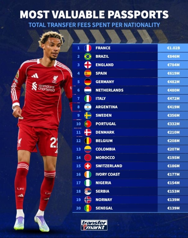 夏窗各国球员总转会费榜:法国球员超10亿欧居首,巴西2英格兰3