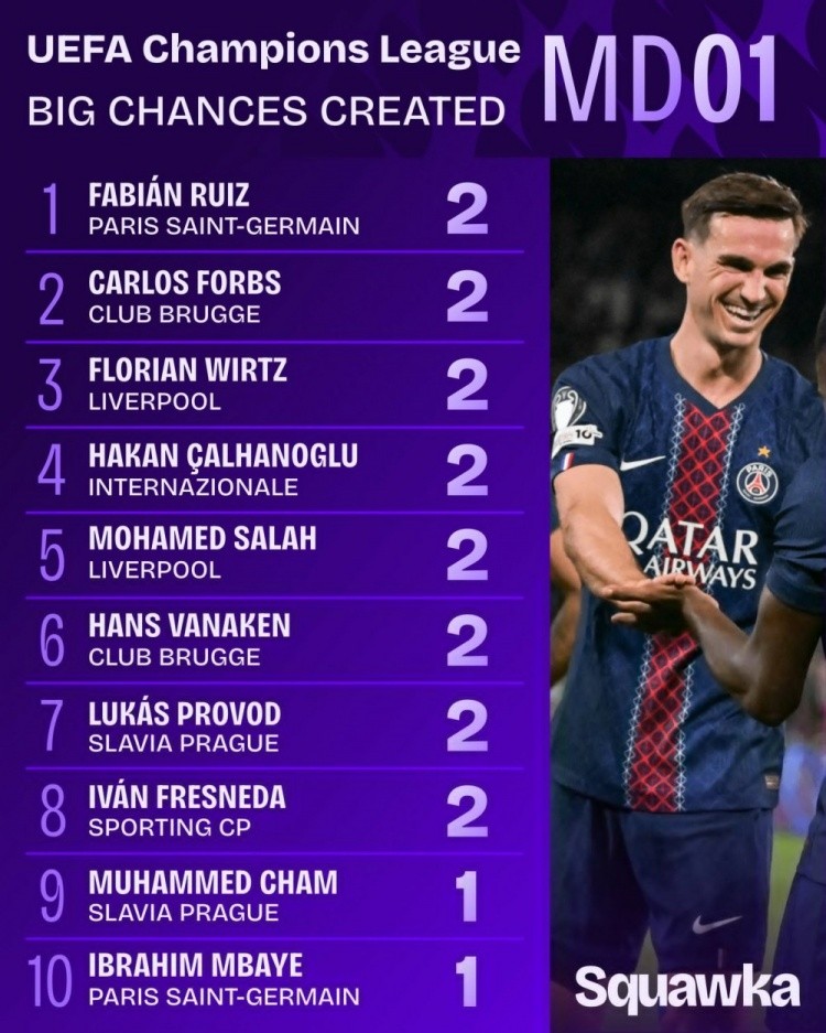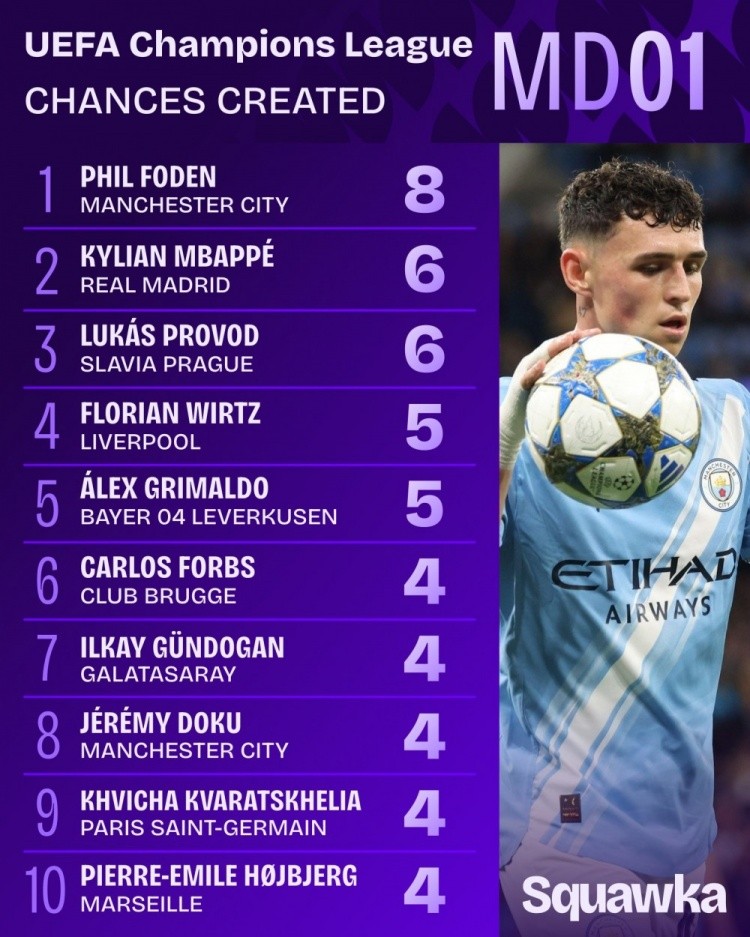 欧冠首轮创造机会榜:福登8次领跑,姆巴佩6次、维尔茨5次