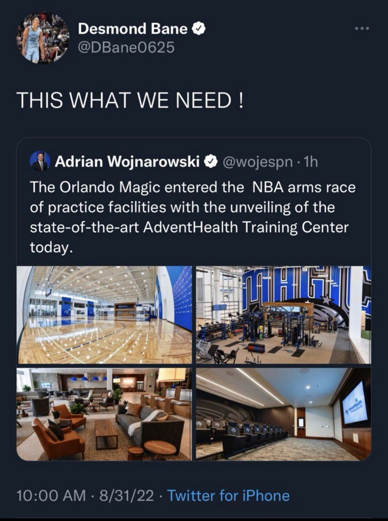 值得一提的是,早在2022年8月31日,贝恩便曾在社交媒体上转发了魔术的球馆并配文:“这是我们需要的!”