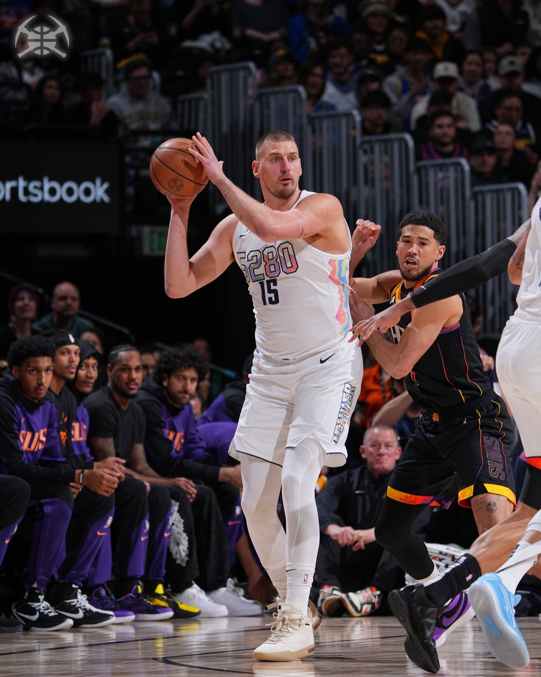 当丹佛高原的月光洒进球馆,约基奇的身影在聚光灯下化作一支未干的墨笔,在篮球的宣纸上挥毫泼墨。今夜,他不再是中锋,而是一位吟游诗人,用31分、21篮板、22助攻的史诗级三双,谱写了一曲属于现代篮球的《神曲》。