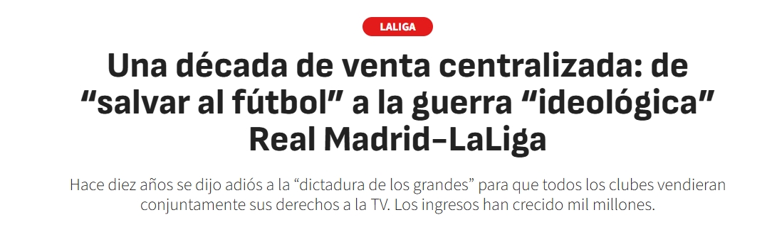 阿斯报文中指出,尽管过去十年电视转播收入增长了117.9%(从8.44亿欧元增至18.397亿欧元),但西甲联盟始终面临一个坚定的反对者:皇马。