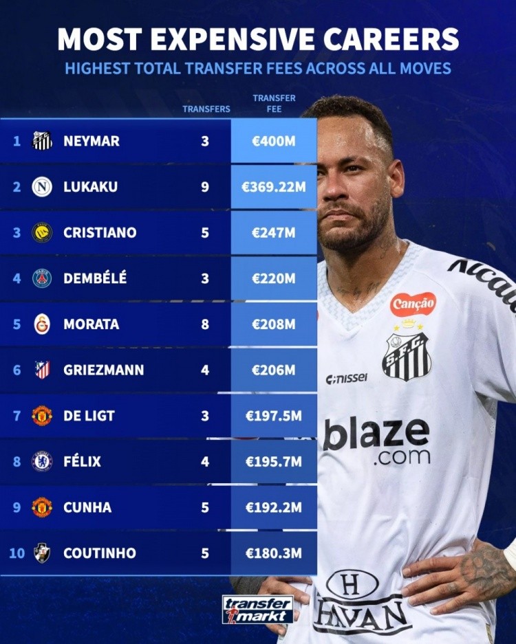 球员生涯总转会费排名:内马尔4亿欧居首,卢卡库、C罗二三位